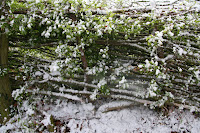 I've been watching this living fence for a year now, enjoying its responses to the changing seasons. It is layered Hawthorn, with a few Hawthorn trees left to grow on. Between the winter and summer pics above, a realisation that wooden fencing is increasingly in short supply globally has added a practical edge to my interest. Traditionally laid in winter, before the sap rises, the stems are severed with a billhook until they lean over on their own with just a small amount of tissue to keep the trees alive. Stumps and "pleachers" (the layered stems) send up new shoots which thicken and strengthen the hedge. Stakes at regular intervals and a woven layer of hazel sticks along the top ("heatherings") keep this living artwork in place - beautiful.